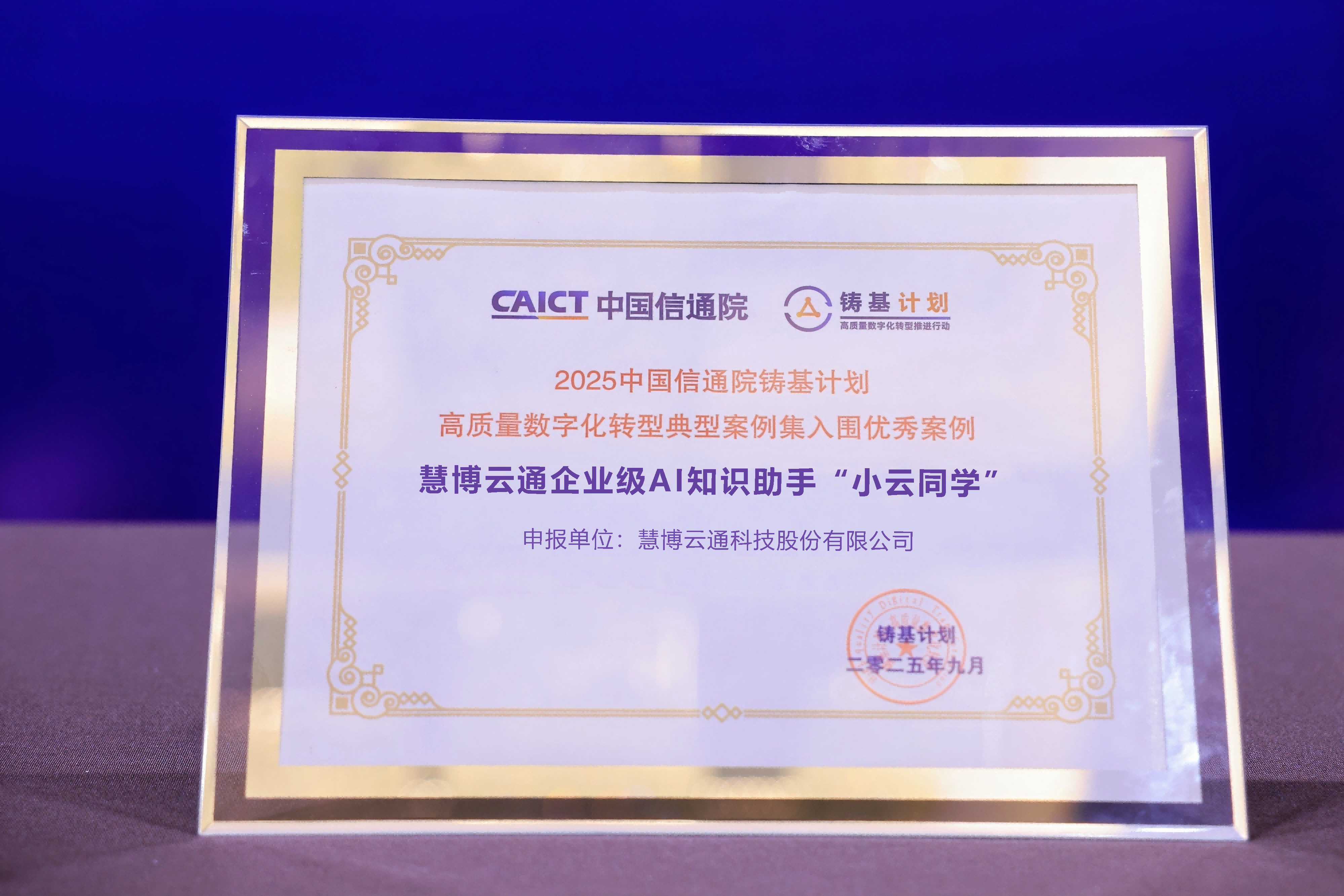 此外,慧博云通企业级AI知识助手“小云同学”入选《2025年度高质量数字化转型案例集》。多项荣誉的获得不仅彰显了慧博云通在数字化转型领域的技术实力,也体现了其在推动行业高质量发展方面的突出贡献。
