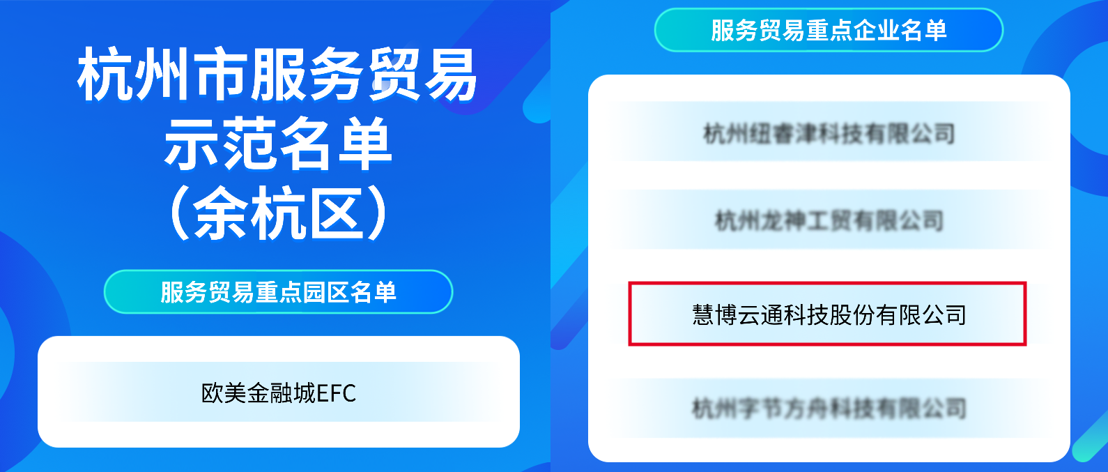 近日,杭州市商务局正式公布2025年杭州市服务贸易重点园区、重点企业名单,慧博云通凭借在信息技术服务领域的优秀技术服务能力和国际化发展实力,成功入选服务贸易重点企业。同时,公司所在的EFC欧美金融城入选杭州市服务贸易重点园区。