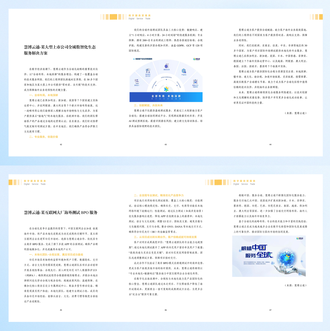 讲好“数贸故事”,传播优秀经验。今年数贸会上,慧博云通“某大型上市公司全域数智化生态服务解决方案”、“某互联网大厂海外测试BPO服务”两项实例,作为模式创新、效益突出、前景广阔的数字贸易发展合作案例,双双获选《数字贸易故事集》优秀案例,向世界传播中国经验、中国智慧和中国方案,充分展现了慧博云通在国际化发展与助力企业出海中的技术能力和综合实力。