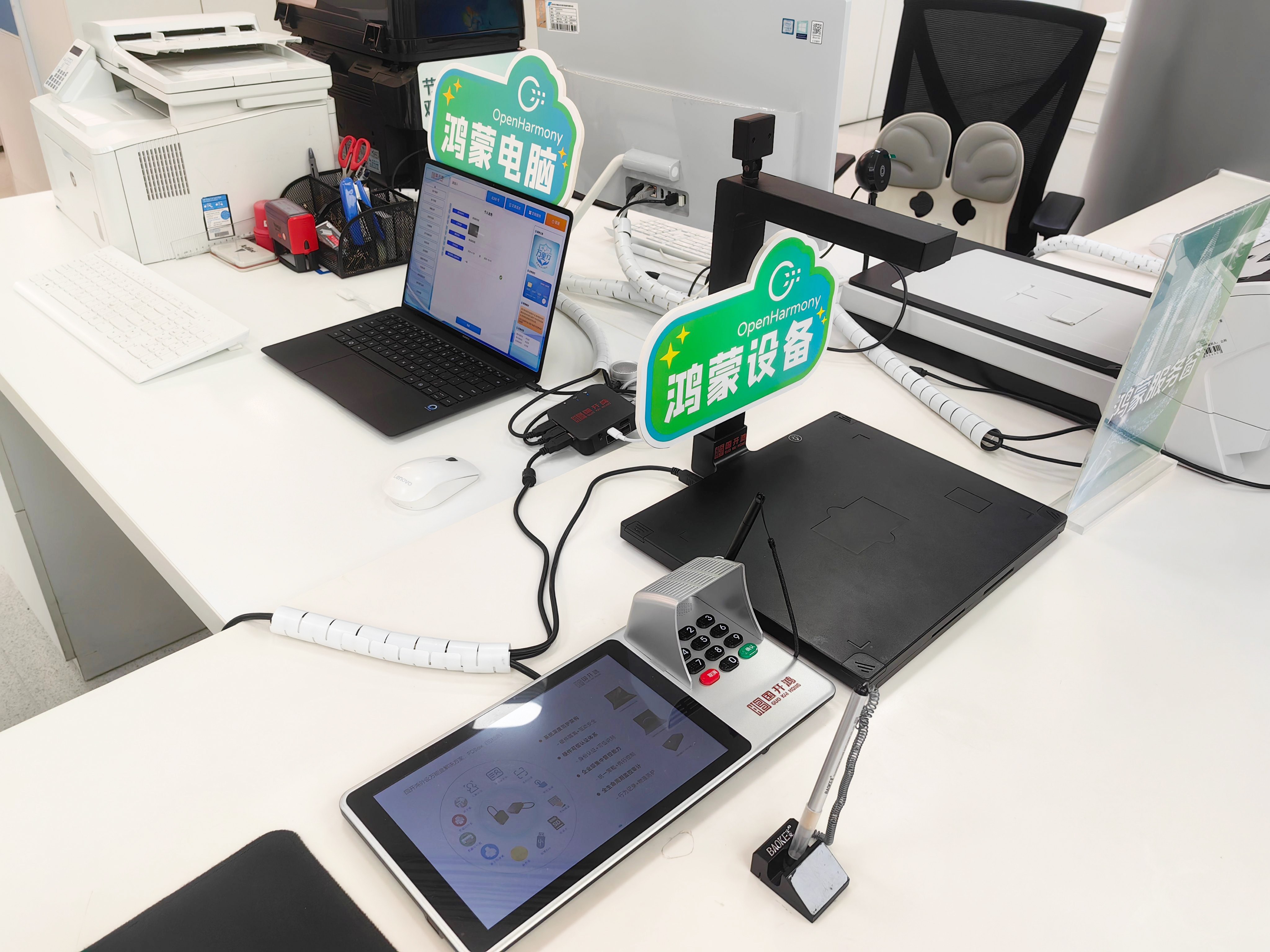 在服务窗口,工作人员不再需要在多个系统间频繁切换,通过一个鸿蒙协同界面,就能完成信息调取、材料打印、业务办理全流程操作。国开鸿依托开源鸿蒙系统对政务业务系统及各类外设设备的适配能力,让不同品牌、不同类型的政务设备实现协同联动,组成“鸿蒙超级终端”。信息调取、材料审核、业务办理一气呵成,为企业和群众提供高效、便捷、智能的一站式办事体验。