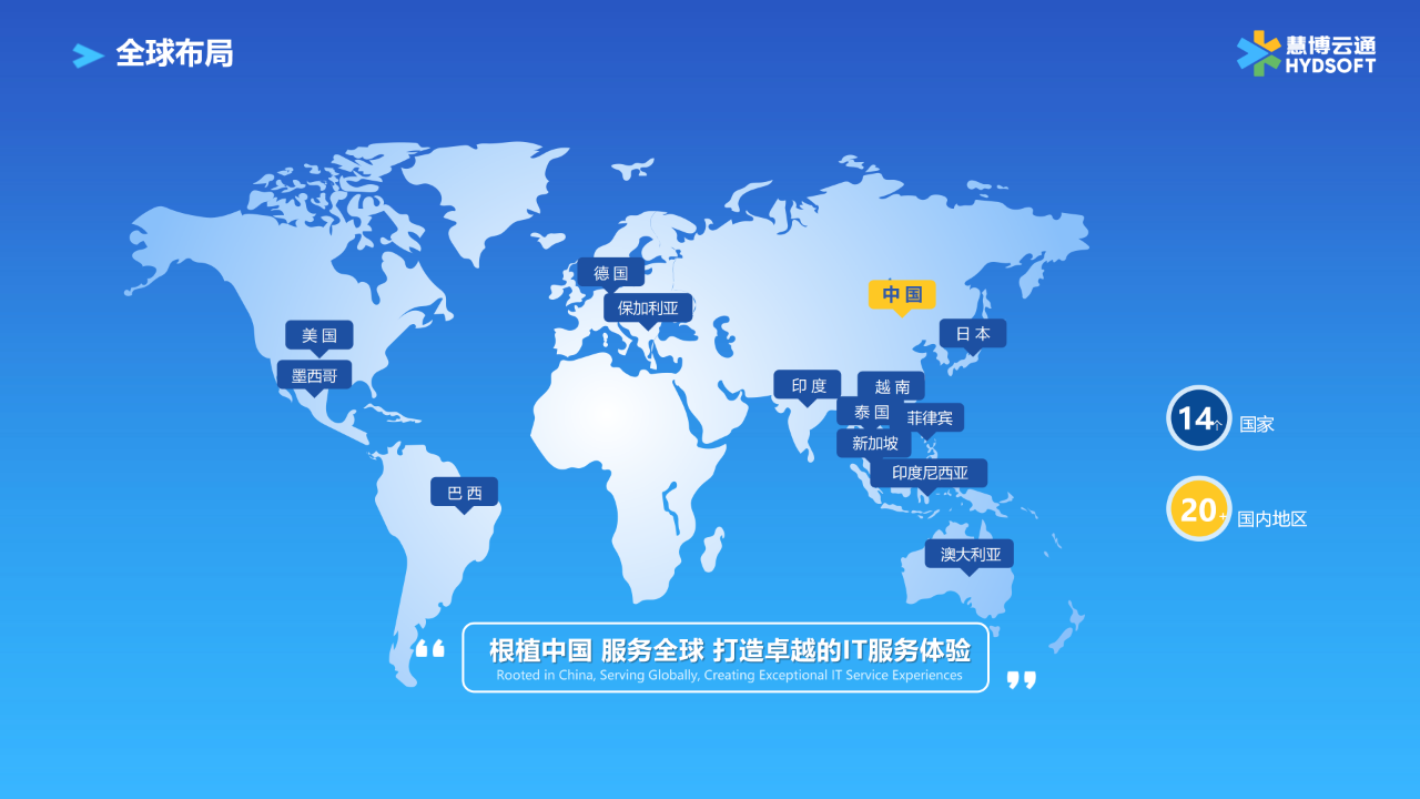 在全球化视野和布局下,慧博云通业务已遍布全球,在美国、新加坡、日本、德国等14个国家以及杭州、北京、上海、深圳等20多个国内城市设立了分支机构或服务团队。公司依托全球化、全栈式服务能力,深度整合人工智能、大数据、云计算及物联网等核心技术,为企业提供从市场洞察到落地实施的一站式出海解决方案。